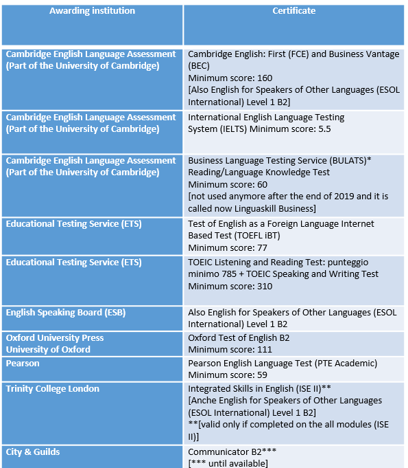 Master Degree Programmes taught in Italian*: list of english language certificate accepted by the Faculty of Engineering proving a level B1 (Common European Framework).