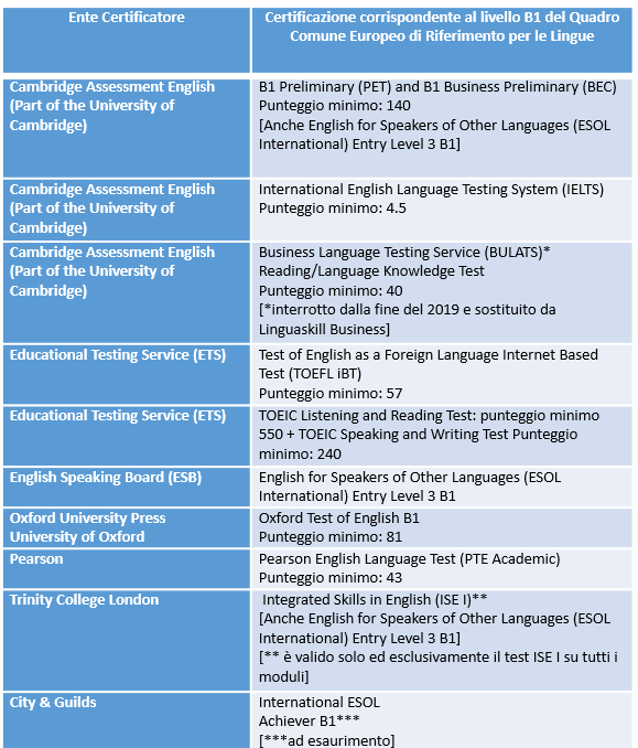 - Lauree (triennali): è richiesta una certificazione di livello B1 (Common European Framework) tra quelle riportate nel seguente elenco: B1 cliccare qui!